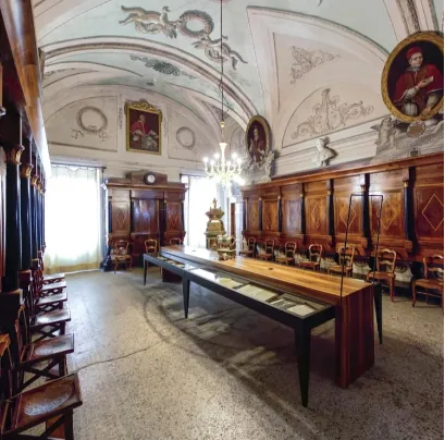 Raum 2: Der Kapitelsaal Sie befinden sich nun im Kapitelsaal. Dieser Raum hat seinen Namen vom Kapitel, d.h. von der Versammlung der Chorherren, die für eine Kirche zuständig waren, und die so genannt werden, weil es Brauch war, während der Versammlungen ein Kapitel aus der Ordensregel oder einen Abschnitt aus der Heiligen Schrift zu lesen. Aus der Möglichkeit, auf einer Kapitelsitzung das Wort zu ergreifen, leitet sich der italienische Ausdruck: “avere voce in capitolo” ab, der wörtlich übersetzt “eine Stimme im Kapitel haben” bedeutet.