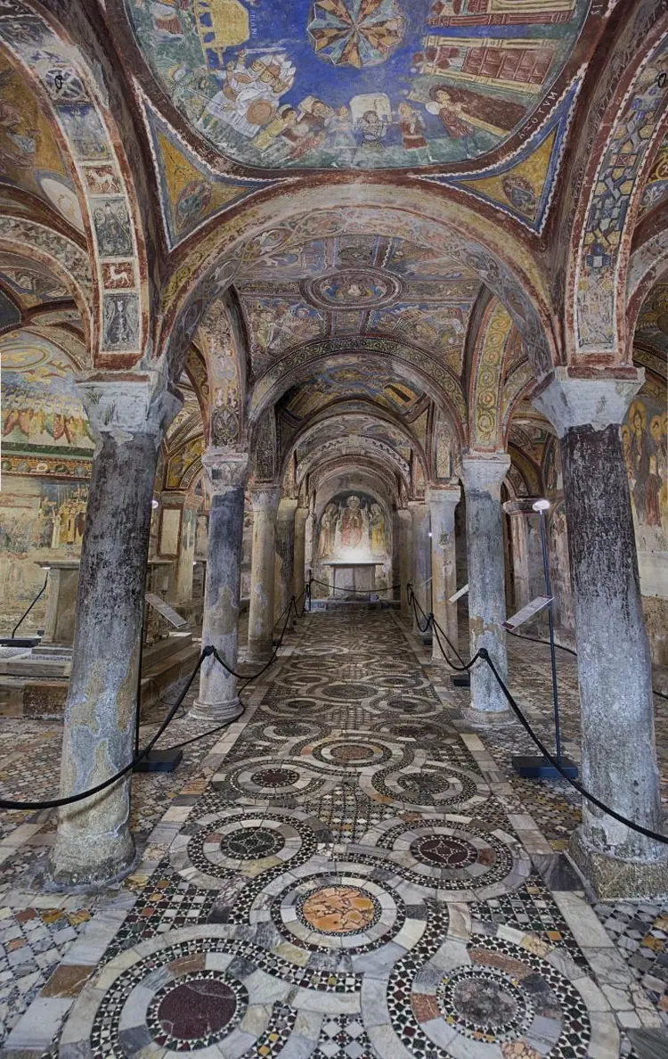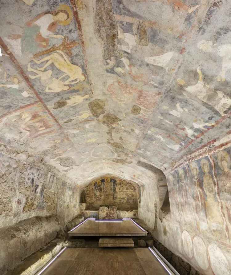 You are now in a Mithraeum dating back to the 1st to 2nd centuries, an old pagan temple dedicated to the god Mithras. This is the oldest part of the entire complex and still displays the original vault structure; its shape is often described as the upside-down hull of a ship.