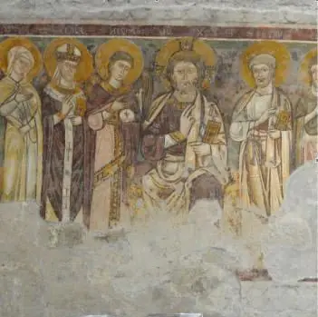 Please make your way towards the exit, to find the last two altars: the smaller one is dedicated to martyr saints, while the larger altar is that dedicated to Bishop Peter of Salerno. The saint is painted on the small apse behind the altar, represented between Saints Aurelia and Noemisia. The fresco is dated 1324 and is attributable to Lello de Urbe, painter of the Cavallini School who was active in the city of Naples and throughout the region of Lazio during the first half of the 14th century. This is the same artist who painted the icon of the presbyter Raynaldo which you saw earlier, in Our Saviour’s Chapel.