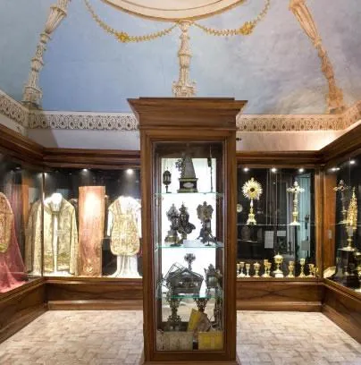Salle 3 la Nouvelle Sacristie La Nouvelle Sacristie est une petite pièce qui abrite des vêtements liturgiques datant du XVIIe au XXe siècle et des objets précieux tels que des calices, des pyxides, des patènes et des ostensoirs de type ambrosien. Nous notons par-dessus tout, les deux burettes en verre de couleur verte et en métal précieux, qui appartenaient à l'origine au pape Paul V Borghèse, ainsi qu’une stauroteca en bois et en nacre. Dans le reliquaire central sont exposés de nombreux reliquaires, dont le magnifique buste en argent de la Vierge contenant la relique de son manteau.